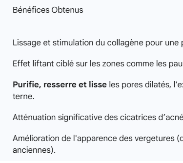 Qualité de Peau : Purification, resserrement des pores dilatés, et amélioration du teint terne et de l'excès de sébum.